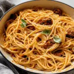 Once your spaghetti is ready, drain it (save some pasta water!). Toss it right into the skillet with your sauce. If it’s too thick, add a splash of pasta water until you reach desired consistency.