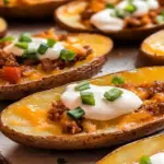 Every time I make potato skins, I’m transported back to my college days when I perfected this recipe in my tiny apartment kitchen. Friends would gather for game nights, and those potato skins were always the stars of the show. The laughter, the friendly banter, and the sheer joy of devouring these crispy bites made those moments unforgettable. spicy chicken burrito recipe So whether it’s game day or simply a Tuesday night craving, get ready for an explosion of flavor with every bite.