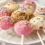 - Fully dip each ball into the melted candy coating and add sprinkles before it sets. Allow to dry completely before serving.