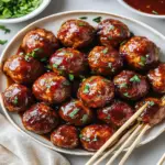 Once cooked through, remove the meatballs from the oven and drizzle them generously with your homemade glaze. Give them another five minutes back in the oven for that sticky perfection! Transfer to plates and serve hot—don’t forget napkins because things might get messy!
