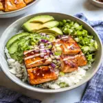 - To assemble, scoop rice into bowls, top with seared salmon and fresh veggies.