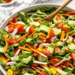 In a large serving bowl or platter, start layering your mixed greens first. Then sprinkle on those delightful tomatoes, cucumbers, onions, and shredded carrots. It’s like creating art – but edible!