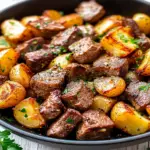 Yes, you can definitely customize the protein in this Garlic Butter Steak Bites and Potatoes recipe. While beef steak is the traditional choice, chicken breast or pork tenderloin can work equally well. Adjust cooking times accordingly, as different meats may require varying lengths of time to cook through properly. Make sure to season them generously with salt and pepper before cooking to maintain the dish’s delicious flavor profile.