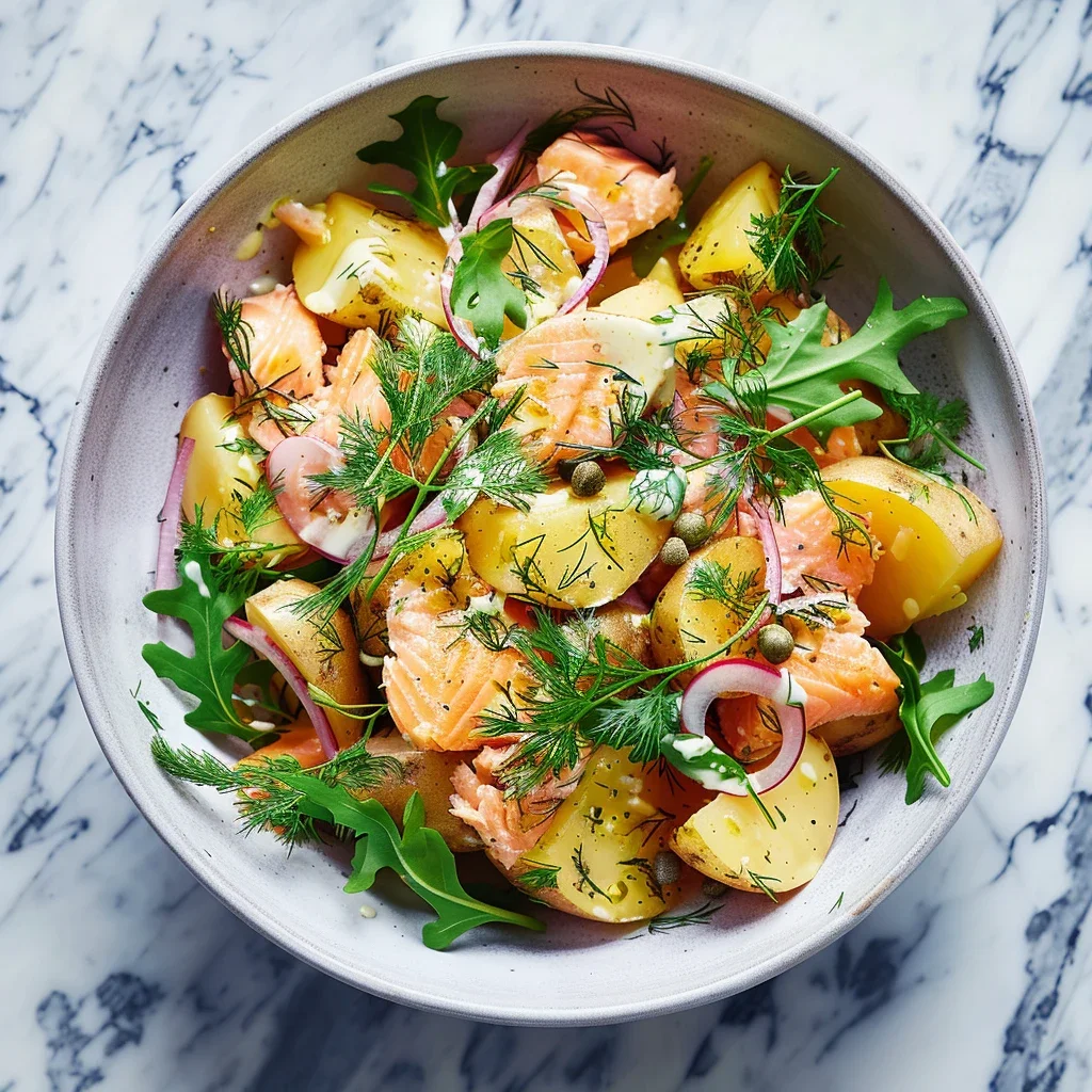 - Add the Salmon: Flake the hot smoked salmon into bite-sized pieces and fold it into the potato salad carefully.