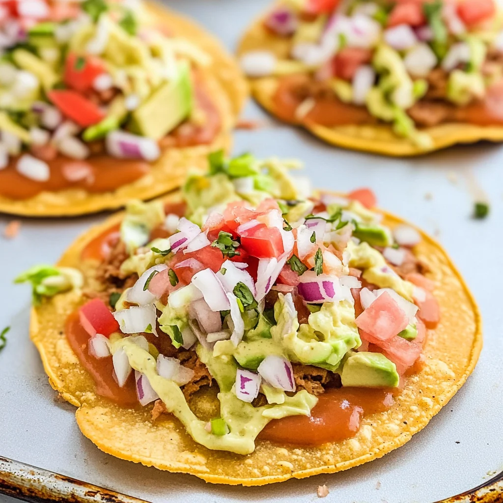Picture this: a warm, golden tostada, its crispy edges beckoning like an old friend who’s just walked through the door. The tantalizing aroma of seasoned beans and zesty salsa dances in the air, while a dollop of creamy avocado sneaks in to play the perfect supporting role. Each bite is a delightful crunch, bursting with vibrant flavors that make your taste buds do a happy jig!
